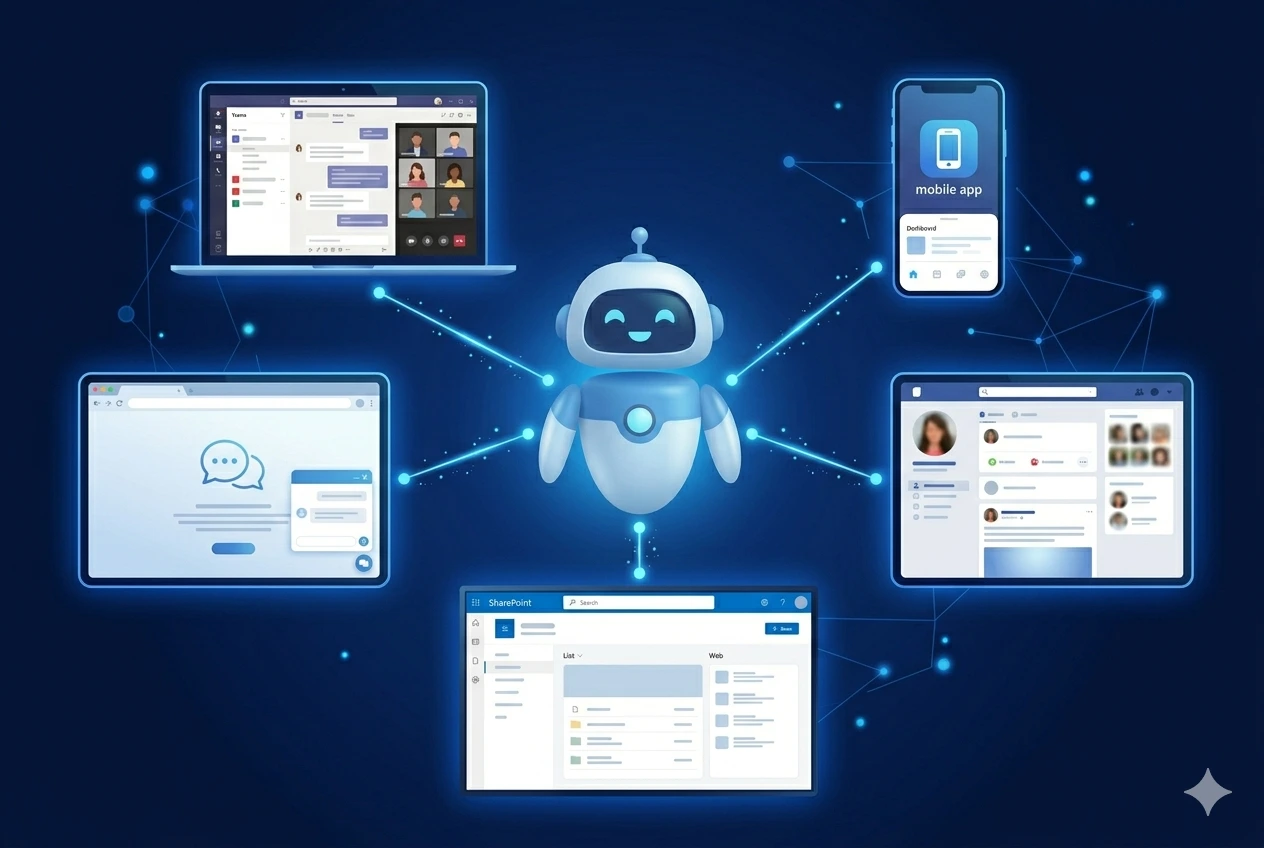 Agents can be deployed across Microsoft Teams, company websites, mobile apps, Microsoft 365 Copilot Chat, SharePoint, Facebook, and other channels supported by Azure Bot Service.